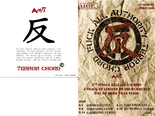 大阪発パンクバンド"TERROR CHORD"、5年ぶりのセカンドシングル!! 自身のURBAN GUERRILLA KILLS RECORDSより自主リリース!! 4曲入りCD+ライブ1曲DLポストカード付き、300枚限定ナンバリング入り!!